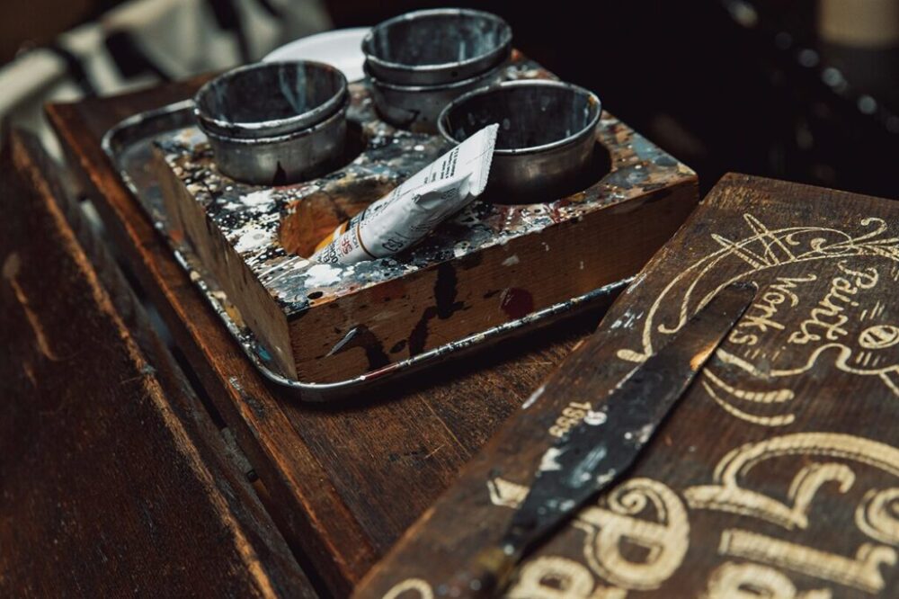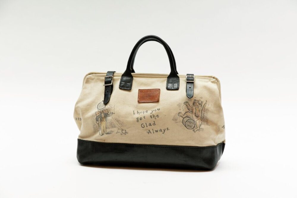 ヴィンテージのメイソンバッグをモチーフにしたグラッドハンドのバッグに、自身のアートワークを手描きで加えたスペシャルモデル。仕事道具を収納している。