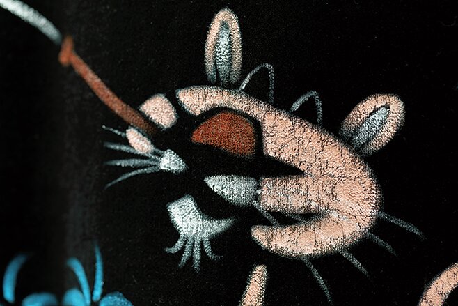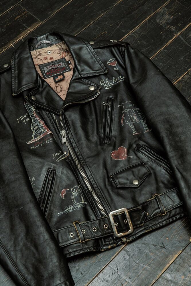 アメリカを代表するライダースメーカーであるショットとコラボレーションした際に制作した大型のアートワーク。すべてL.さんによる手描きであり、これをプリントした生地が共作モデルに使用されたのだ。