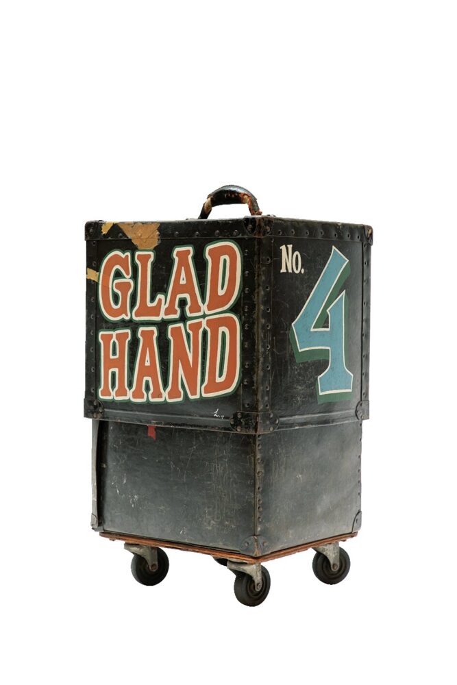 自身がポーター表参道で開催したエキシビションで展示した作品。映画のフィルムを保管するためのヴィンテージのケースに、グラッドハンドのロゴなどをハンドペイントで描いている。