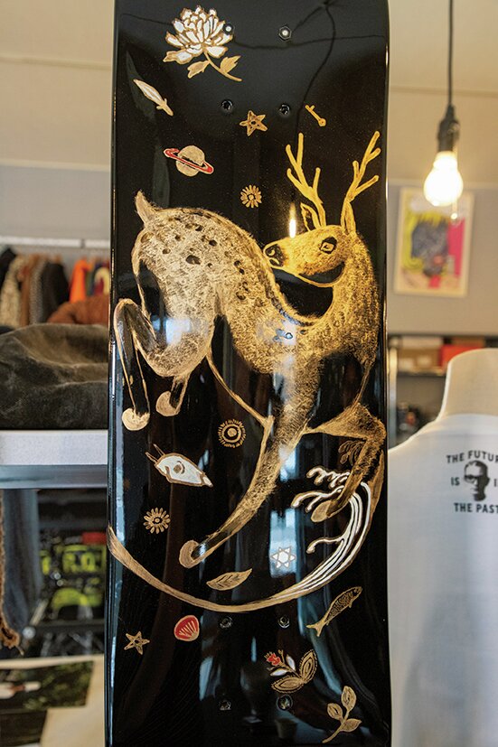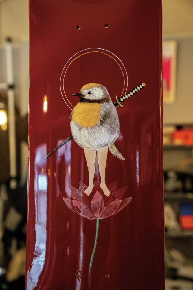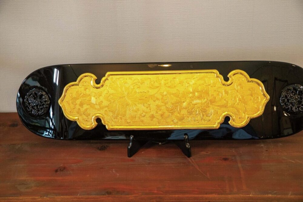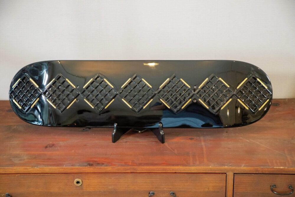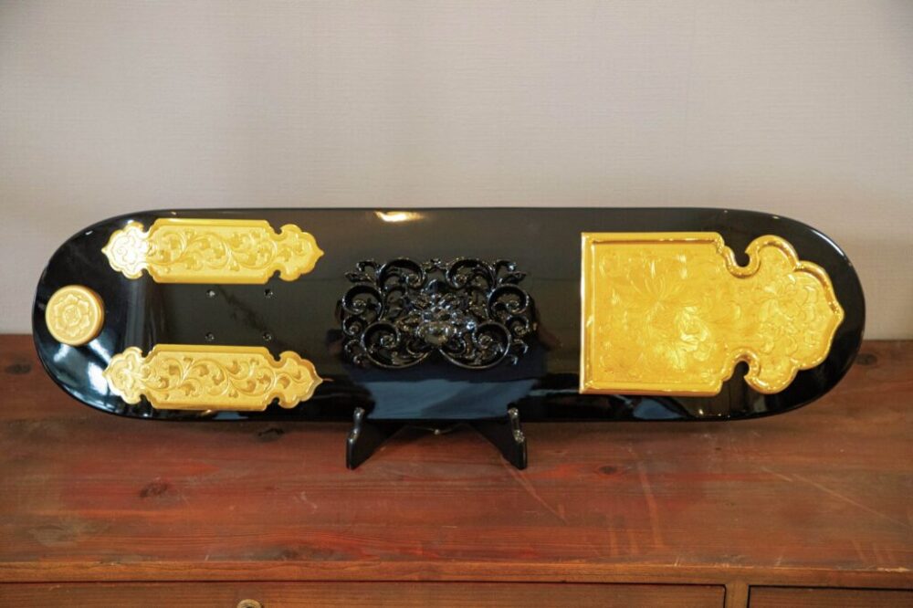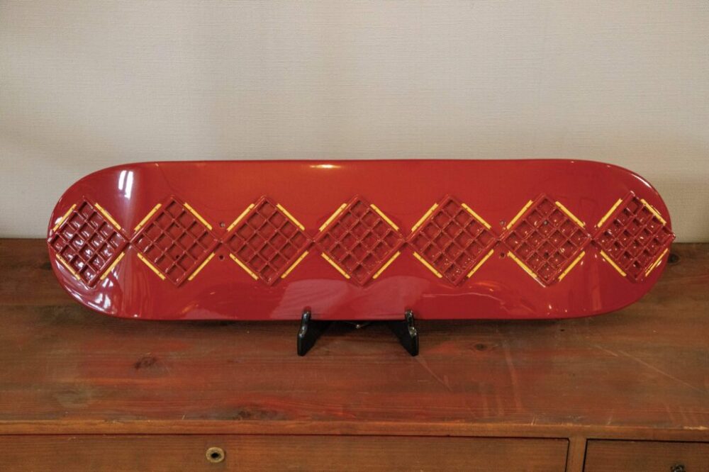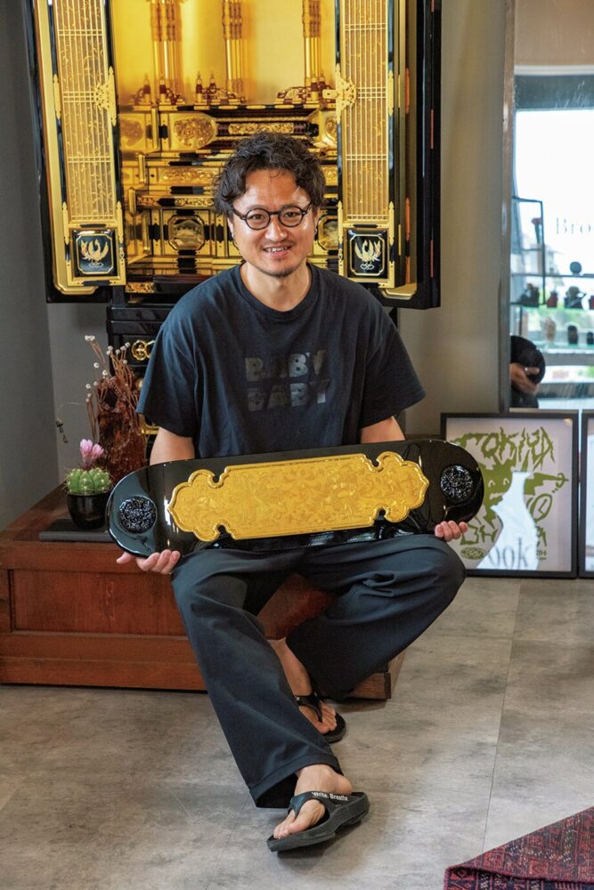 スケートボードのデッキに漆塗りを施した後、仏具などに使われる建具や金箔の装飾品をあしらった「オリエンタルデッキ」。実際の制作は、実家の会社に在籍する仏具製作の職人が手がけただけあって、塗りはもちろん細かい細工の仕上げまで見事な仕上がり。
