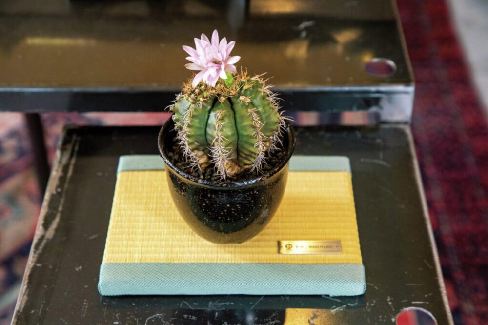 より手軽に漆をというコンセプトで信楽焼に漆を塗った器と、同じく滋賀の畳店とコラボした漆塗り×信楽焼ポット。サボテン付きで約1万円と手に取りやすい価格。