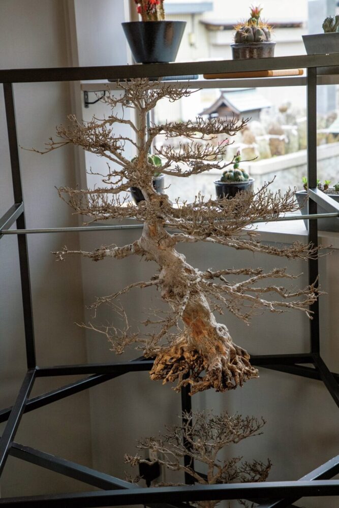 たまたまサボテン農園を訪れているときに見かけて一目惚れした枯れ盆栽。売り物でなかったものの無理して譲ってもらったものを、鉄作家の知人が手掛けるフレームと組み合わせることで見事なアート作品へと仕立てた。ディスプレイとしてインパクト大。応相談