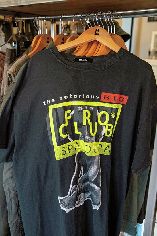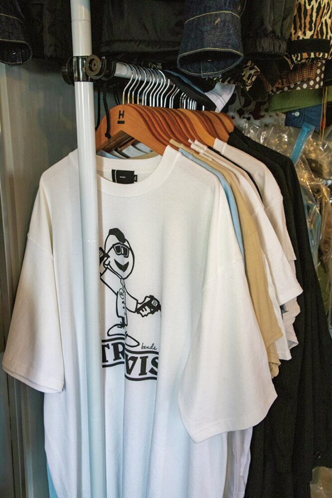 小川さんが関わるブランドのウエア類。右はカジュアルブランド「bend(s)」(@bends19)。左は自身のブランド「HANEI」(@hanei_color_your_life)と京都を中心に銭湯カルチャーを発信する「FROCLUB」(@fro_spadupa_club26)とのコラボ品