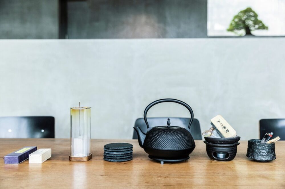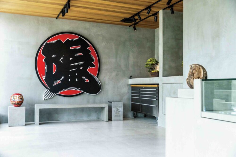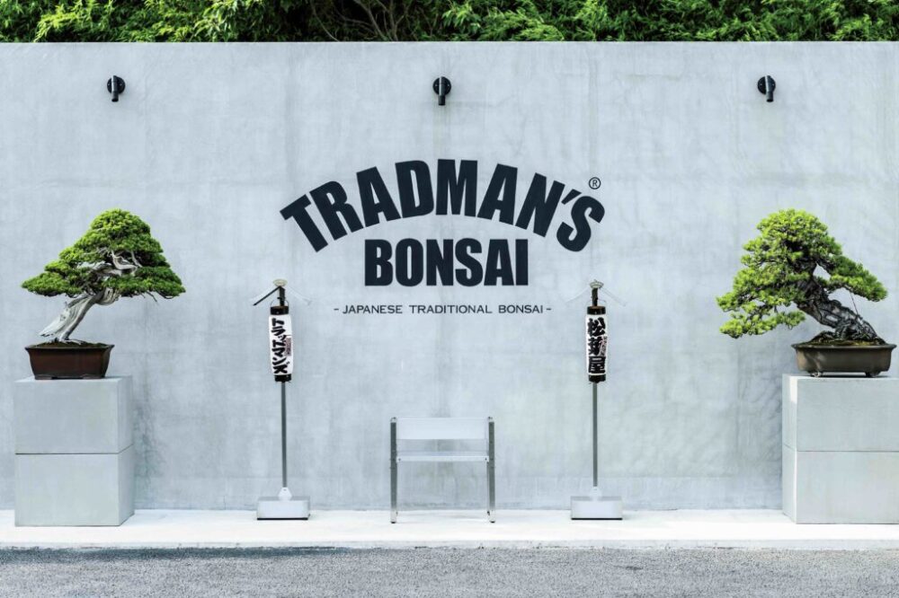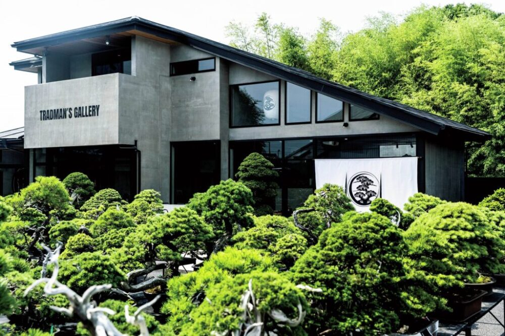 数々のブランドや企業と“盆栽のある空間” を表現しており、それは本拠地となるギャラリーでも体現。モルタルの無機質な壁に力強い盆栽が映えていた。