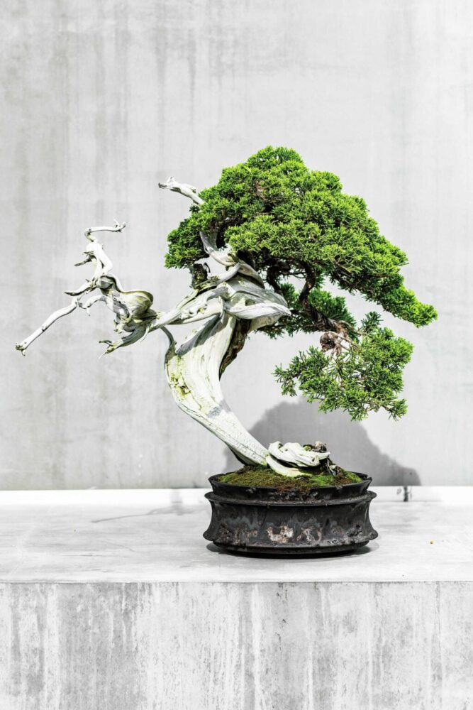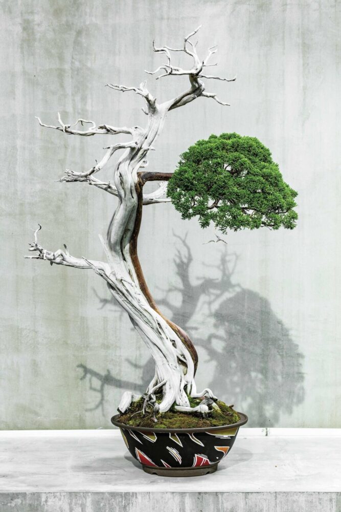 小島さんがもっとも得意とするのが、真柏と呼ばれる手法。木の一部をあえて枯れさせることで、生と死を表現。その分、緑の部分に栄養が行くため、青々とするのだ。
