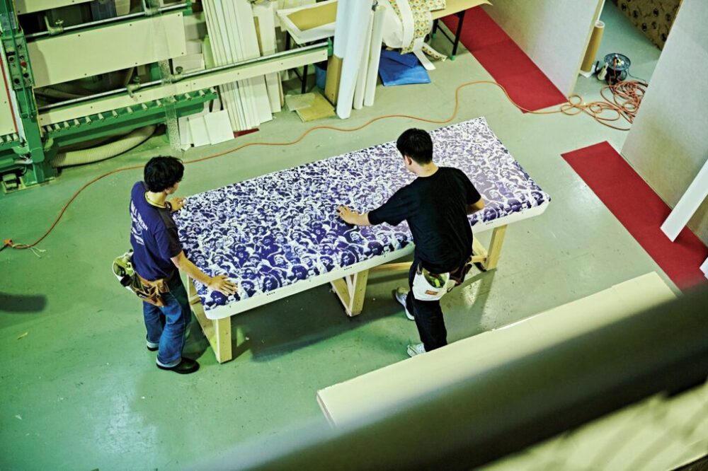 自社ファクトリーでは、大型の壁紙や看板などにも対応できるようにかなり広いスペースを持っている。熟練した職人たちが揃い、メイドインジャパンにふさわしいクオリティを実現。