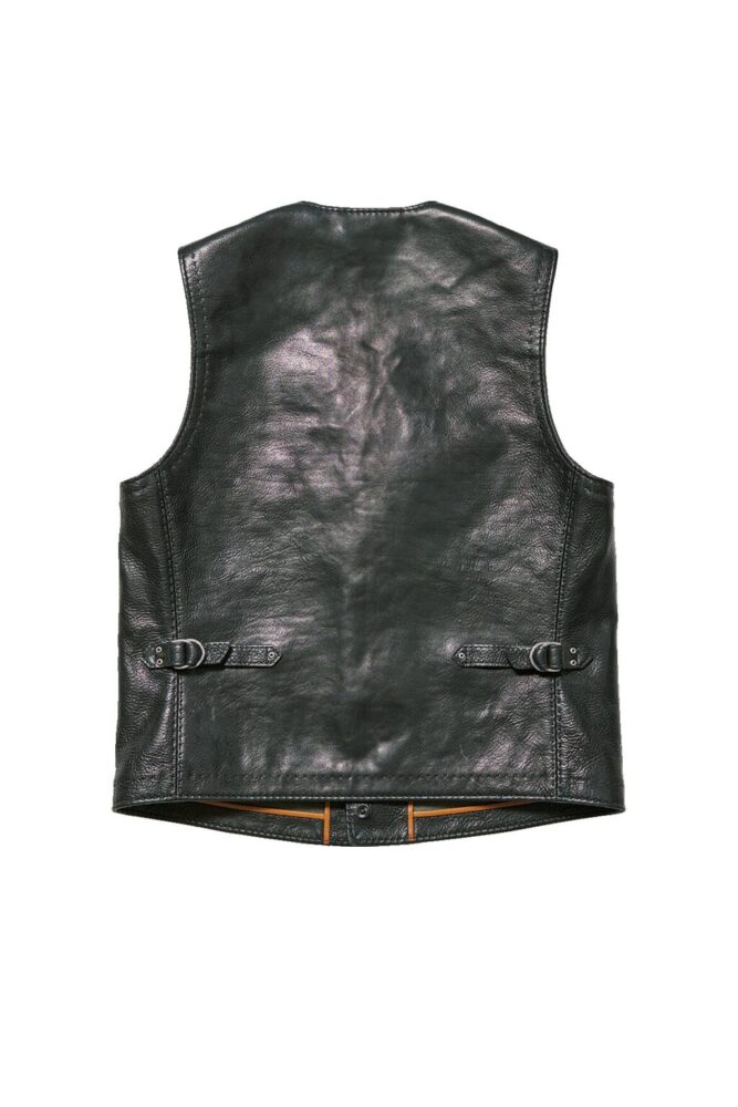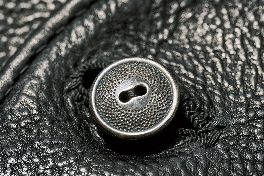 このショップで動画撮影をした際に、ゴールデンレシオでレザーベストをオーダーしたのだ。飯島氏の革ジャンは、そのほとんどを手縫いで縫製している。そんな革ジャン、世界を見渡しても稀有である。その仕上がりは、ため息が出るほど美しい。裏地はなく、裏の縫製まで堪能できる仕様。革はバダラッシの牛革を使用し、ボタンやリベット、アジャスターベルトに至るまで、すべてシルバーという豪華仕様にしてしまった。