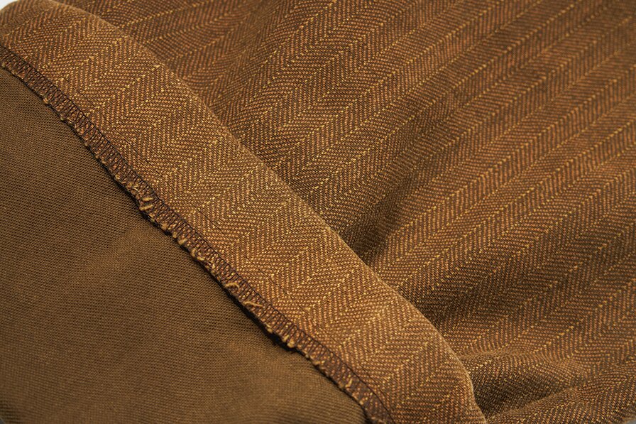 で、このワークトラウザーズ、フレンチワークの代表的な生地であるモールスキンながら、ヘリンボーン柄にストライプが入る「むむむ」な生地。聞けば、戦前のヴィンテージに見られた織り柄をプリントによって表現する手法(ウォバッシュ生地などもその代表)を踏襲して、昔ながらのシルエットで再構築したというもの。さらにオゾン加工によってヴィンテージさながらの雰囲気に。そんなトッピング全部盛りみたいな仕様と、昨今、注目度が高いフレンチワークの雰囲気に脱帽です。