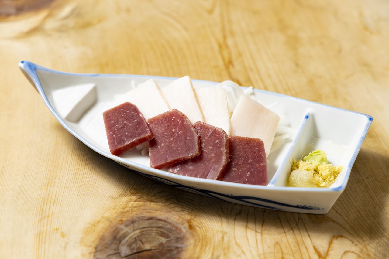 くじら御さしみ・皮とさしみのミックス(1600円)。さっぱりした脂が後引かず、お酒ともよく合う。