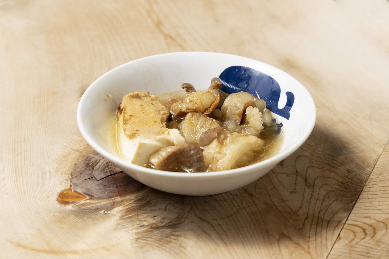 牛煮込み(680円)は5種のもつが入っている。ショウチョウ・モウチョウ・テッポウ・ウワ・ゲハラ。土日は早々に売り切れるので要注意。