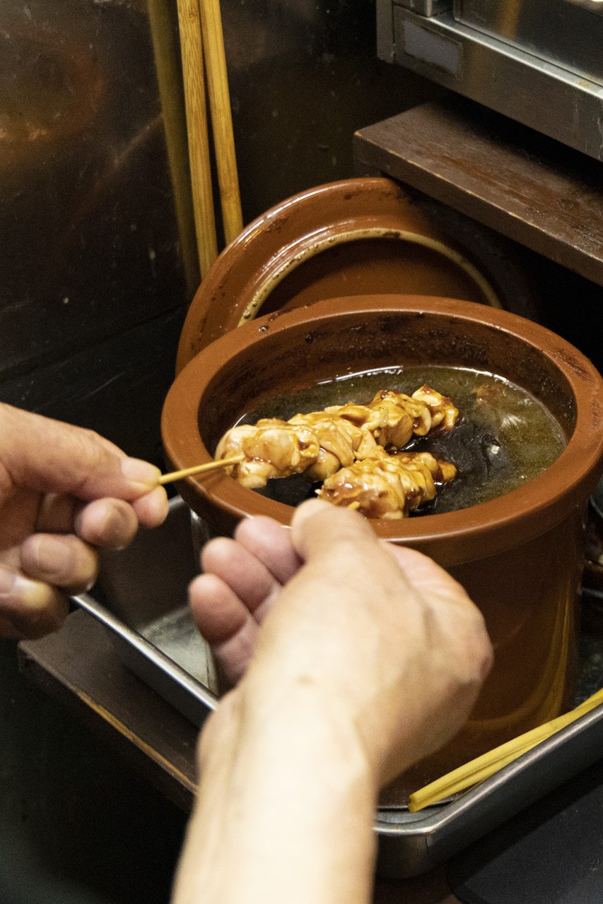 秘伝のつけだれは、大将が研究に研究を重ねたもの。お酒に合うように醤油ベースで甘くないたれにしている