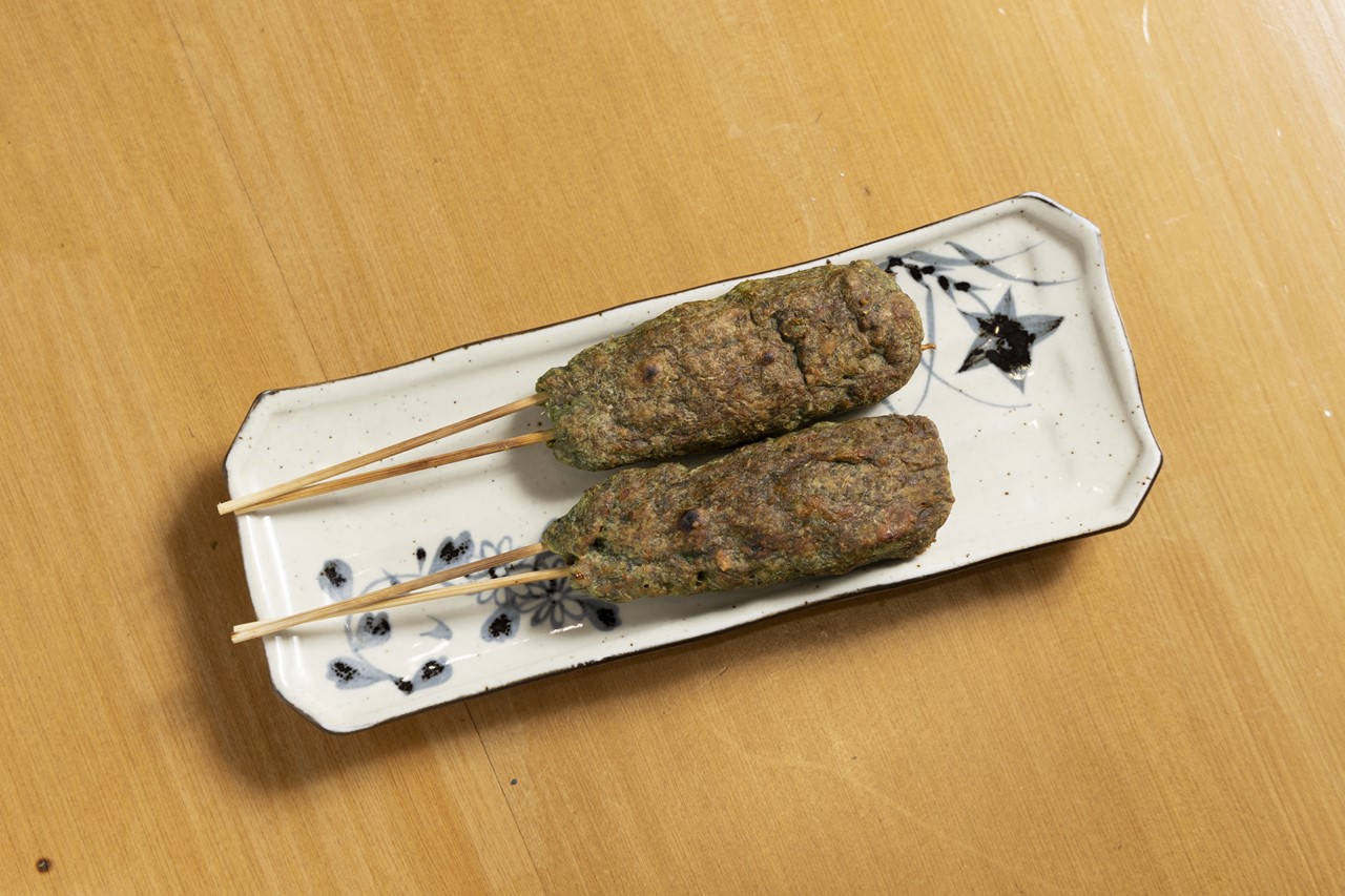 看板の千羽焼き(280円)はつくねの香草焼き。入っている3種の香草は何かを当てる趣向が面白い。