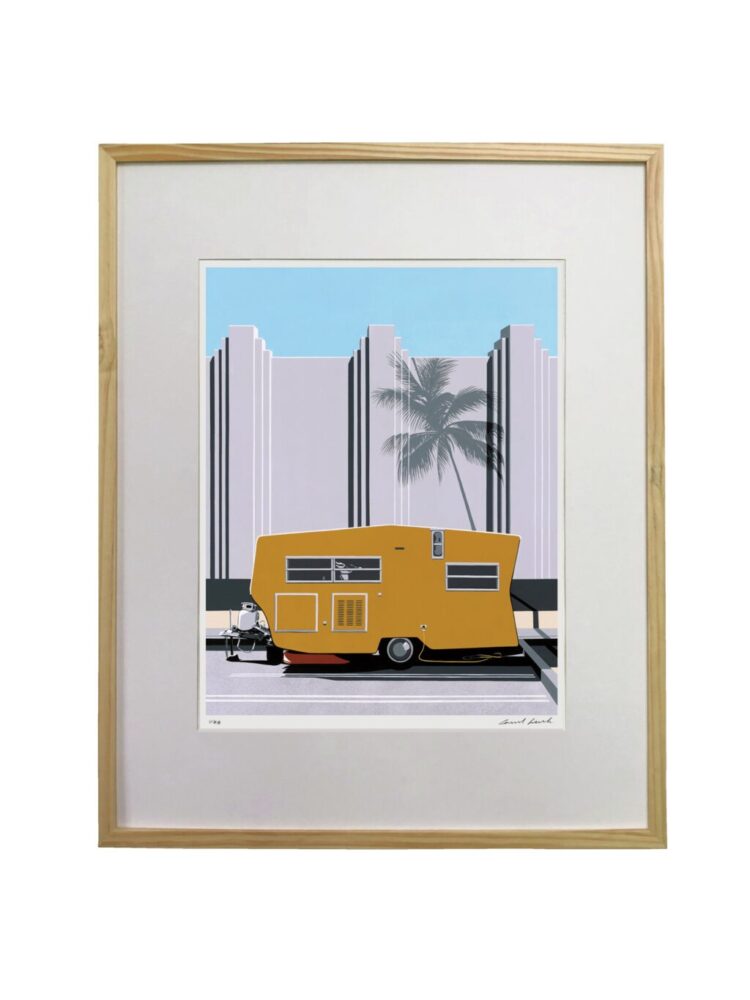 街中にある建物の前にキャンプカーを停車しているというギャップを取り入れた作品。椰子の木の陰をアクセントに。