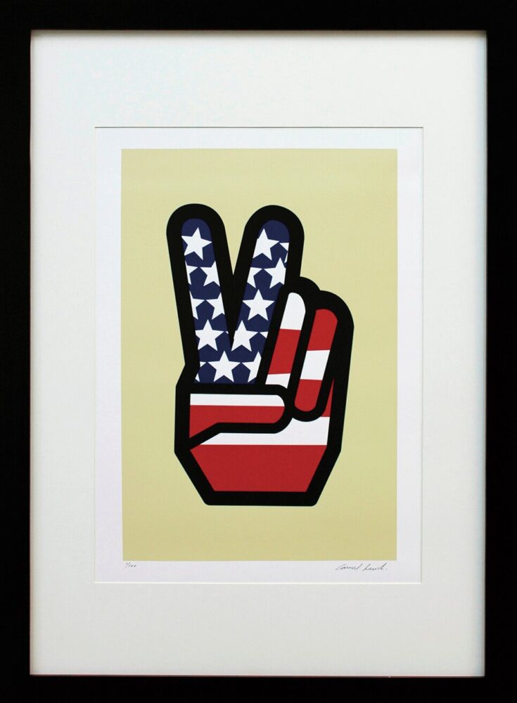 日本語で「二指の敬礼」に星条旗をあしらった作品。印象に残るポップなデザインで、彼の代表作のひとつ。