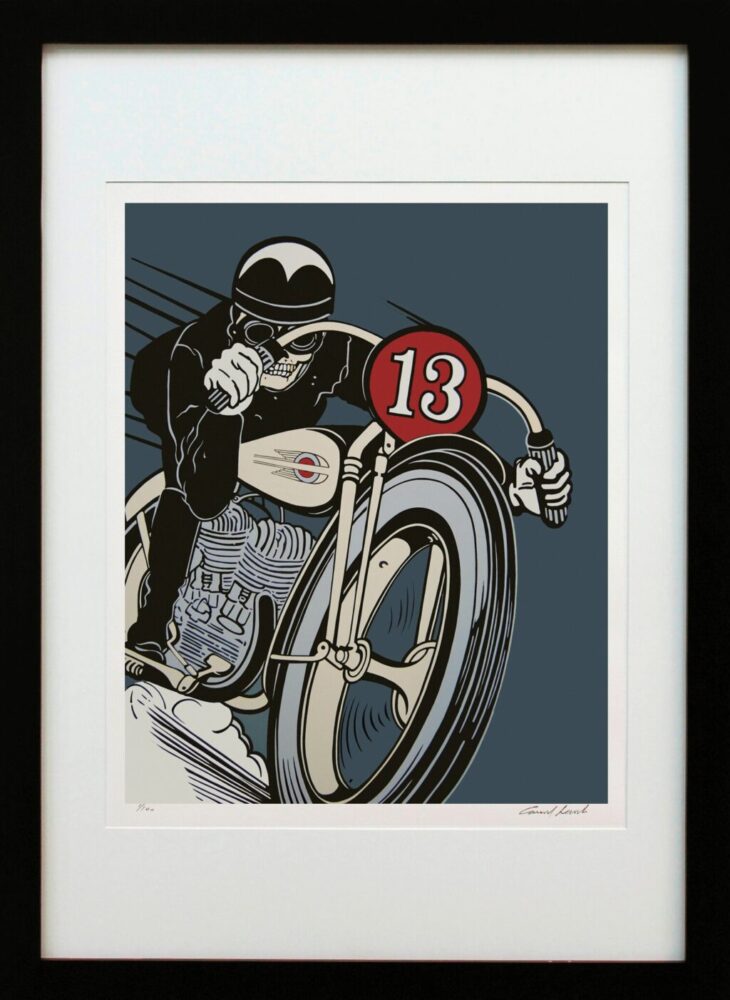 骸骨が「13」の番号を付けてバイクに乗っている疾走感のあるコンラッドの代表作。稲妻入りなどバリエーションもある。