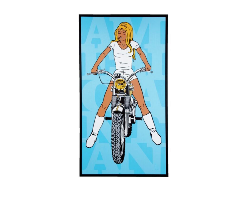 女性がバイクにまたがるポップな作品。バッグのブルーバックには「AMERICATAN」の文字のレタリングが。