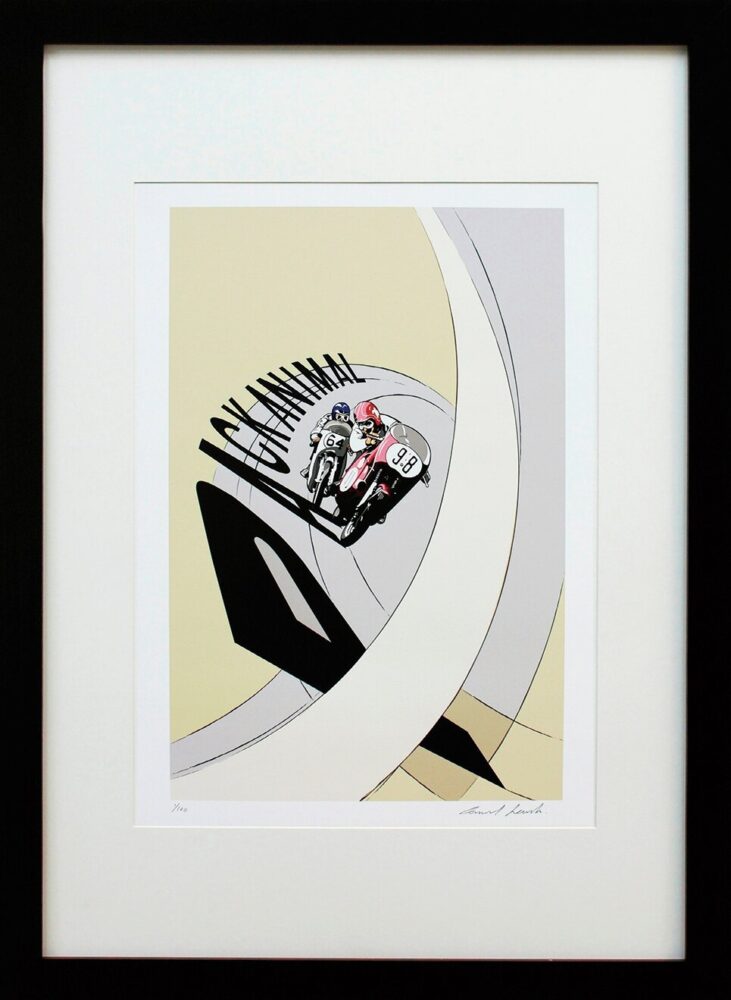 2台のバイクがせめぎ合いながら走る横に、「PACK ANIMAL」のレタリングと組み合わせた珍しい作品。