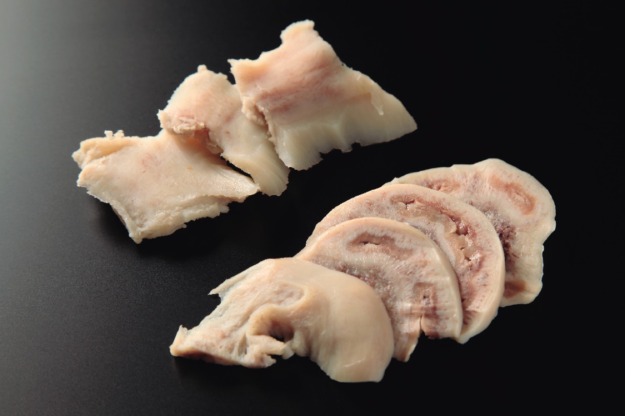 いわゆる牛タン。英語のtongue(舌)が名前の由来だ。赤く肉質は緻密で、枝肉にはない弾力、歯ごたえが魅力。ビタミンA、B2、鉄、タウリンなどの栄養素が豊富だ。先端部は硬いので通常は使用しない。