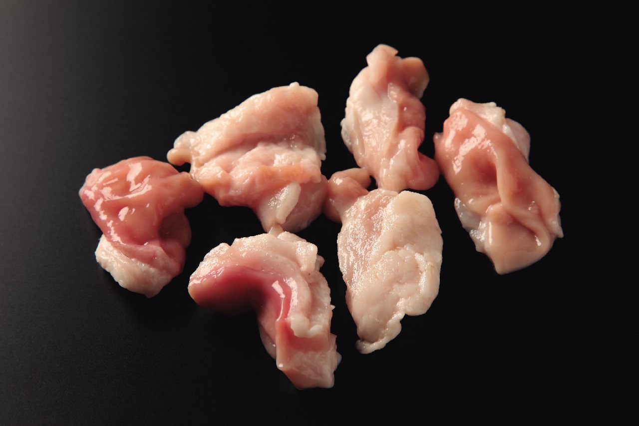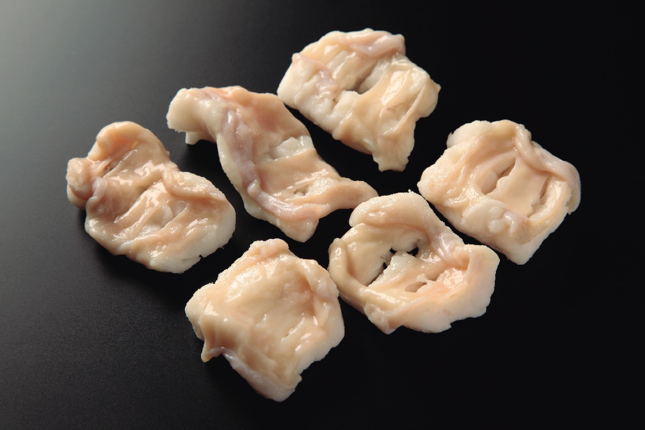 心臓で、名前は英語のheartから。常に動いている筋肉のかたまりなので脂は少なく、緻密な筋繊維のために弾力のあるコリコリした食感が特徴で、タウリ ン、ビタミンB1、ビタミンEが豊富に含まれている。