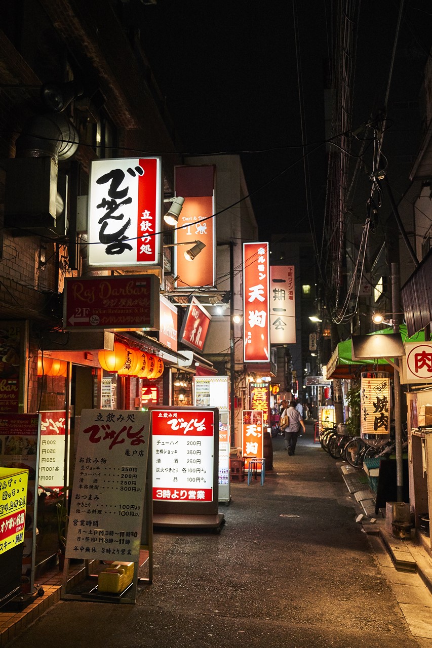 JR総武線亀戸駅北口から、線路と並行するように通る亀戸中央通り商店街までのエリアに広がる飲み屋街。駅前に漂う独特の怪しい雰囲気に押されず路地へと歩いていけば、ホルモンの焼ける匂いが鼻をくすぐる。そう、亀戸の特徴といえばホルモンだ。人気の「亀戸ホルモン」を中心に新旧様々なホルモン店が軒を連ねる。地元風の人たちに混じって遠方から訪れる女性客や若いサラリーマンも多く見られる。