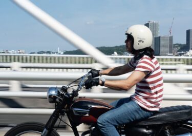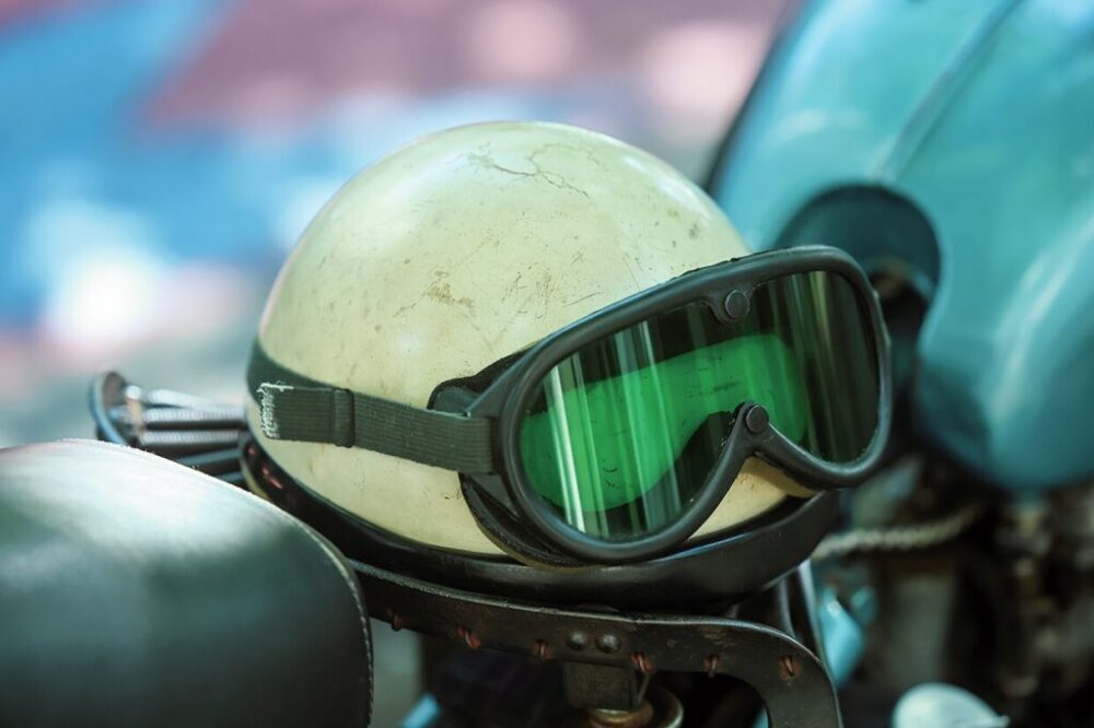 ヘルメットは、当時のアメリカのレースシーンでも使われていたフランス製のROMER。ヴィンテージで探して見つけたもの。