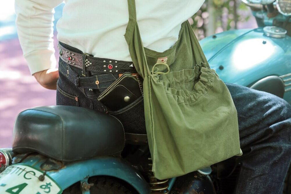 第二次世界大戦時のアメリカンレッドクロスのエプロンをバッグとして使用。バイク工具なども入れられるので便利だ。