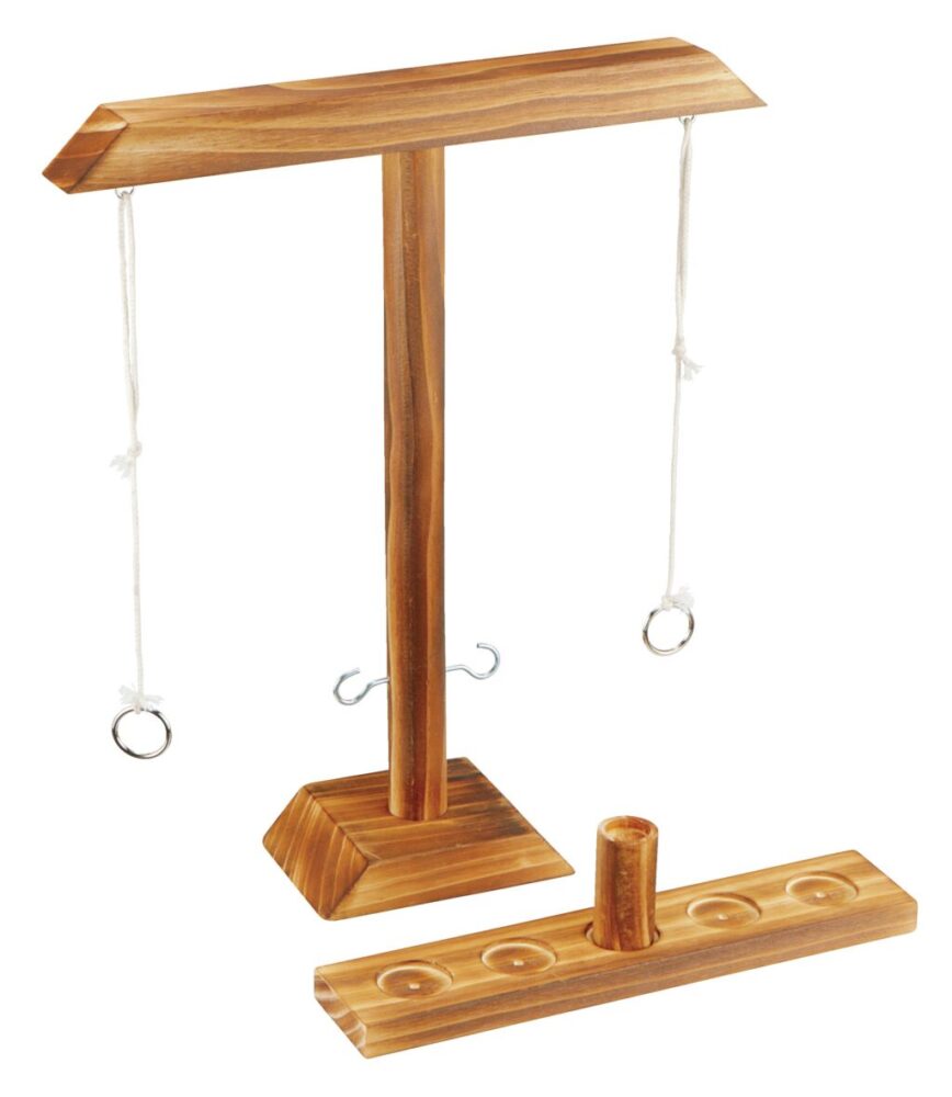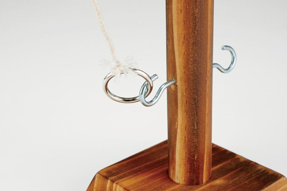 一対一で対戦を行うのがルール。何度でもやり直して、先にフックにひっかけた方が勝ち。楕円を描くようにリングを投げると引っ掛かりやすい。