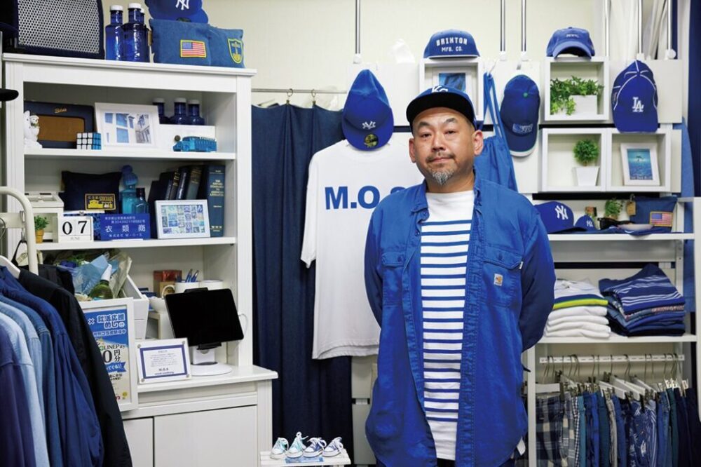 「すべて青い古着だけを扱っているんですよ」と自身も全身真っ青な服に身を包んだ、オーナーの大間洋一郎さんが言う。