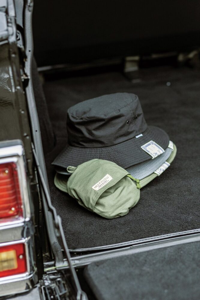 撥水性のあるコットンアクリルウェザー生地を使ったハットは、コンパクトに畳めるパッカブル仕様。ブリムが長いデザインなので、アウトドアフィールドでも活躍。1万3200円