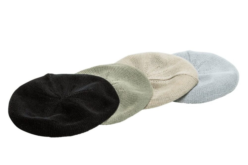 ビッグシルエットが際立つベレー帽は、コットンリネンとサーモ糸をブレンド。通常のベレー帽よりもボリューム感があるので、シンプルなデザインながらもしっかりと個性的に。1万450円