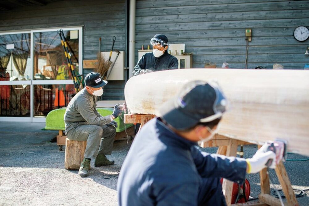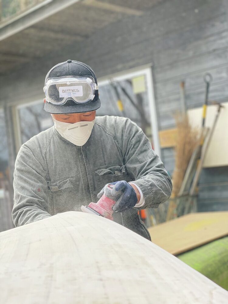 躯体には全て飯能名産の西川材を使用しているものの、もちろん木材だけで浸水や腐食を完全に防ぐことは不可能。必要十分な強度と浮力を獲得するには、組み上げた躯体にガラスや炭素繊維を含んだFRP樹脂を塗ってはやすりを何度も繰り返す必要がある。この工程が途方に暮れるほどに大変だったと当時を振り返ってくれた。
