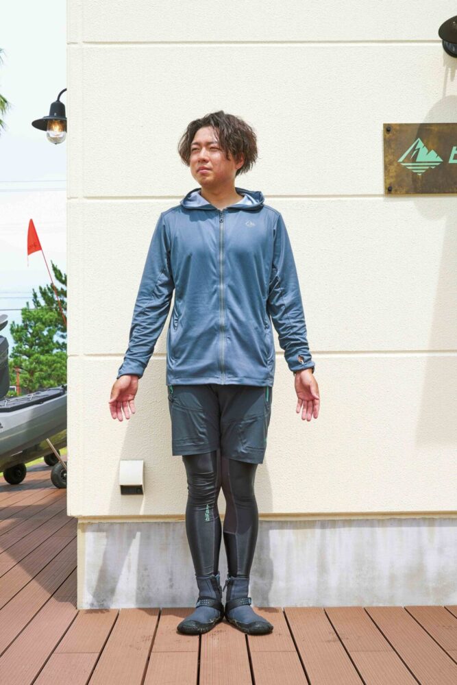 (パーカ)動きやすい伸縮性抜群のラッシュパーカ。速乾性の高さと紫外線対策で最高レベルのUPF50+の生地が採用されており、快適にパドリング&釣りが可能だ。9900円