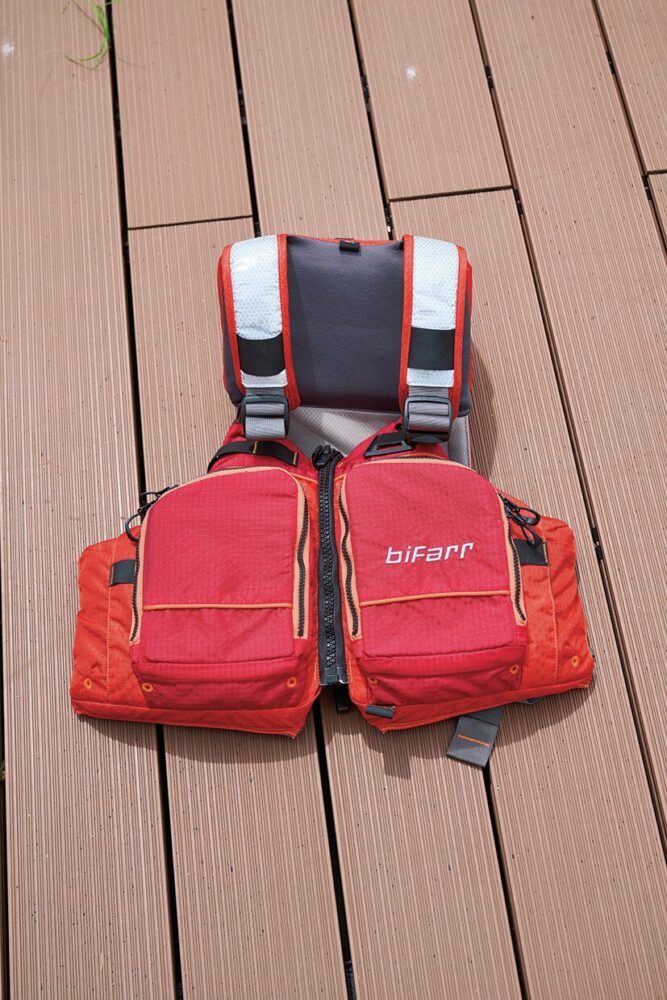 カヤックフィッシングで使用されるシットオンタイプのシートに合わせたライフジャケット。パドリングと落水からの再乗艇を考慮した実用的なデザインとなっている。2万7500円