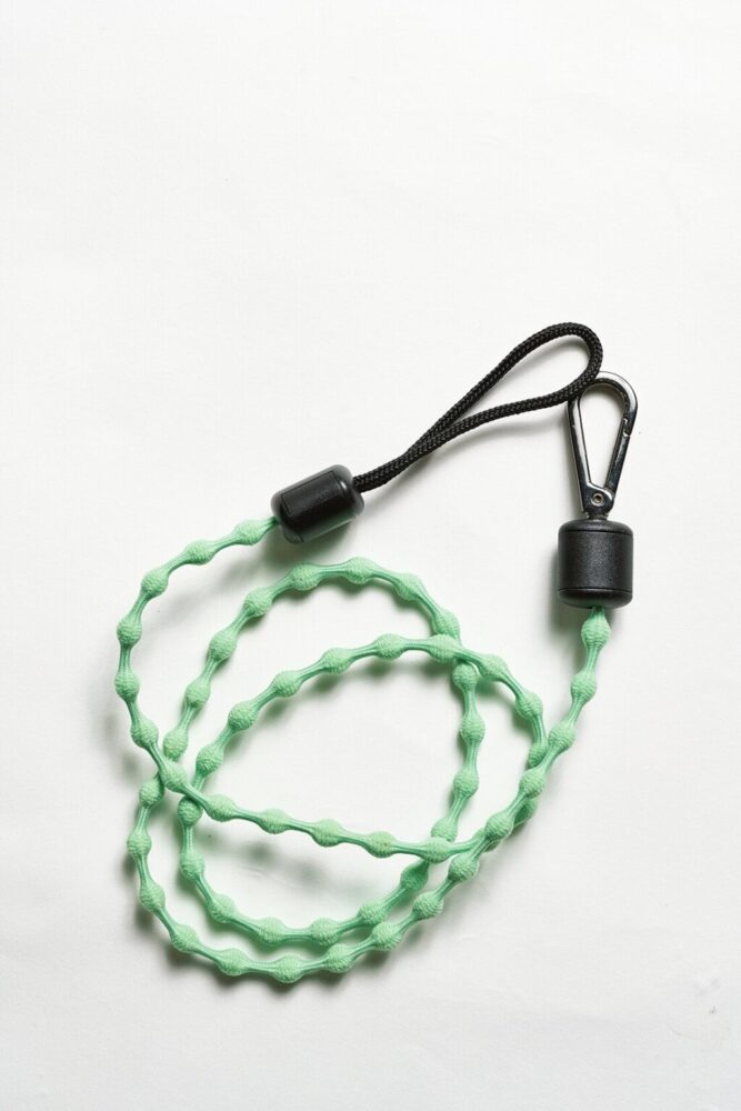 カヤックフィッシングでは道具の落下防止のため欠かせないリーシュコード。この「ウミブドウ」は伸縮性が高く、ラインが絡まることもないため釣りに集中できる。1540円