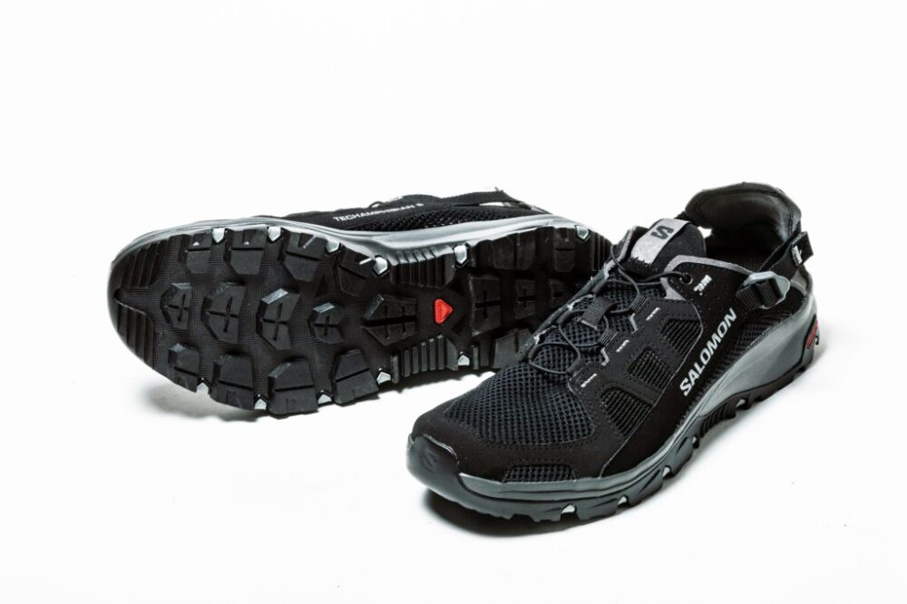 「道具としてオススメの筆頭は、ウォーターシューズのテックアンフィビアンですね。速乾性と耐久性、そして排水性に長けたアッパーは言わずもがな、トレランシューズで培ったアウトソールを組み合わせているので、不安定な足場でも滑りづらいんです。また快適なクッション性と反発性があるので、川遊びからキャンプまで使えますし、タウンユースでも快適です。
