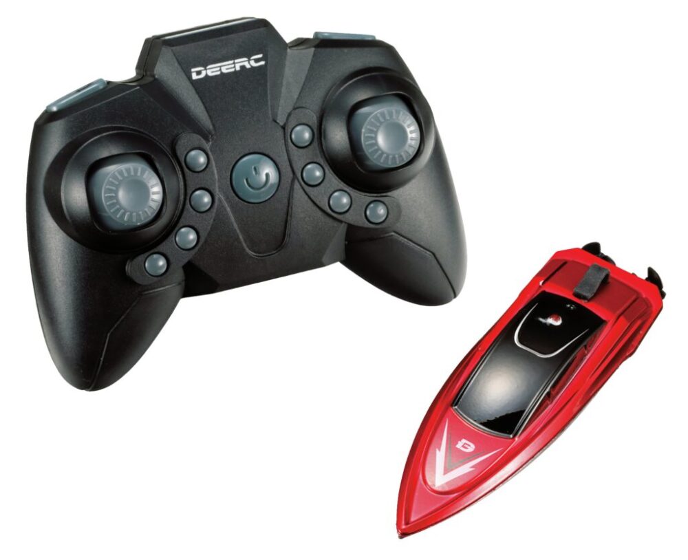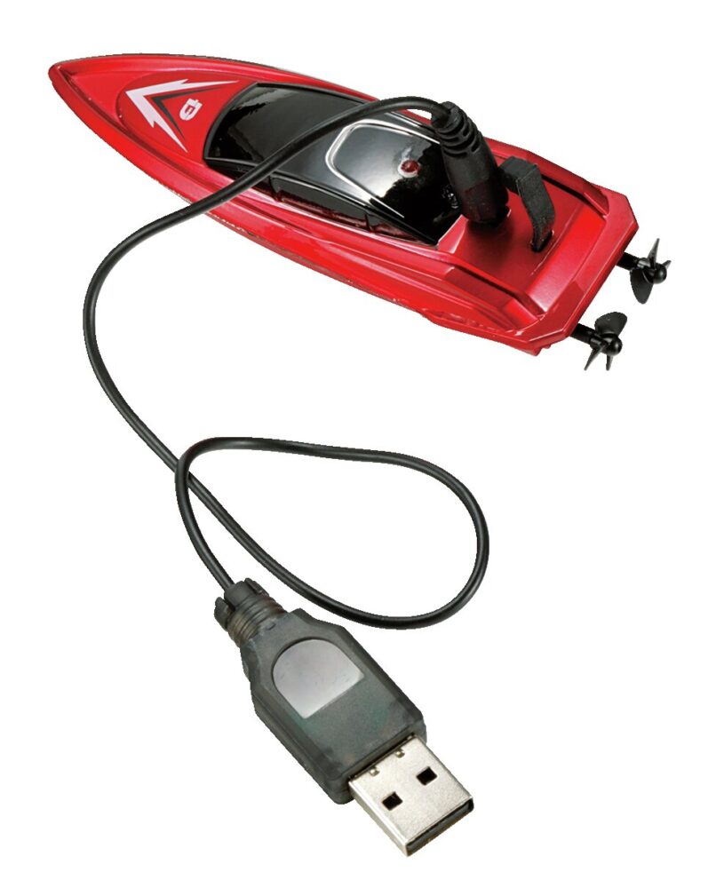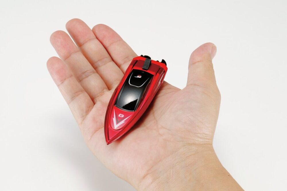 サイズは全長105㎜。約25分の充電で約12分間遊ぶことができる。着水すると電源が入り、送信機とのペアリングが可能。