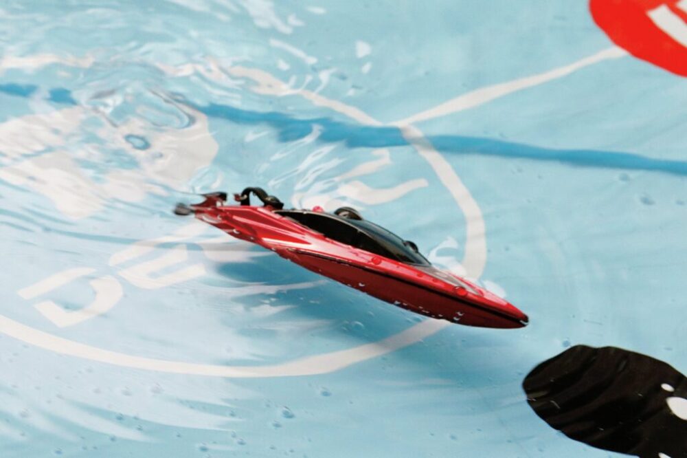 小型RCボートはお風呂で遊ぶのが定番だが、このモデルには大きなビニールプールが付属する! しかも空気入れ付き。