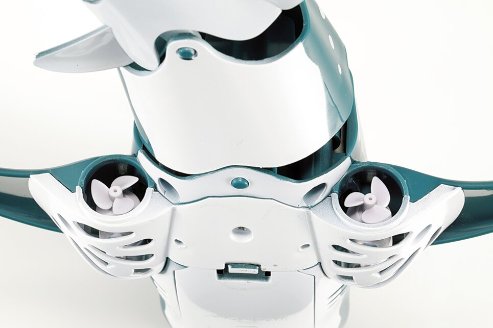 ヒレの付け根の部分に推進用のスクリューを2基配置する。バッテリーは本体中心の蓋を開けた場所に装着する。電源のスイッチはない。