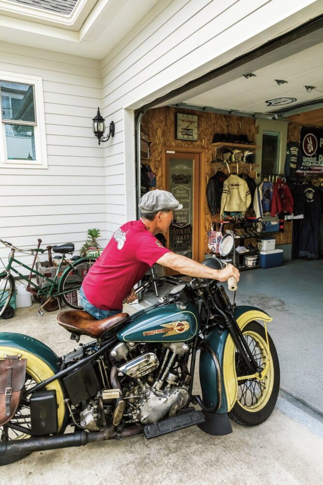 オーバースライダーを開けるとガレージの中には1936年式のナックルヘッドが収まる。これまでも旧いハーレーやアメリカ車などを所有してきたそうだが、現在はこのナックルヘッド一台のみが中央に収まっている状態だ。