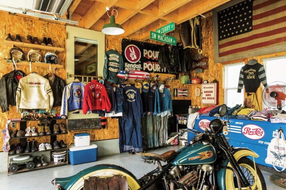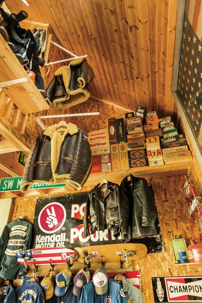ガレージ内はOSB合板が張られ、壁面には所狭しと革ジャンやブーツ、ヘルメットなどが並ぶ。奥の古いペプシロゴが入るのは巨大な冷蔵庫。
