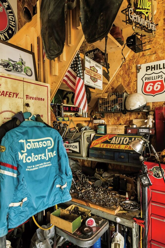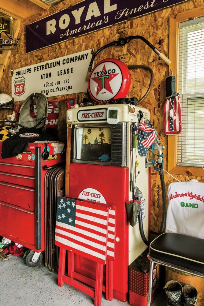 ガレージは自分で整備も行うため巨大なツールチェストが置かれている。その隣は上部にがスランプが乗る旧いガスステーションのポンプ。