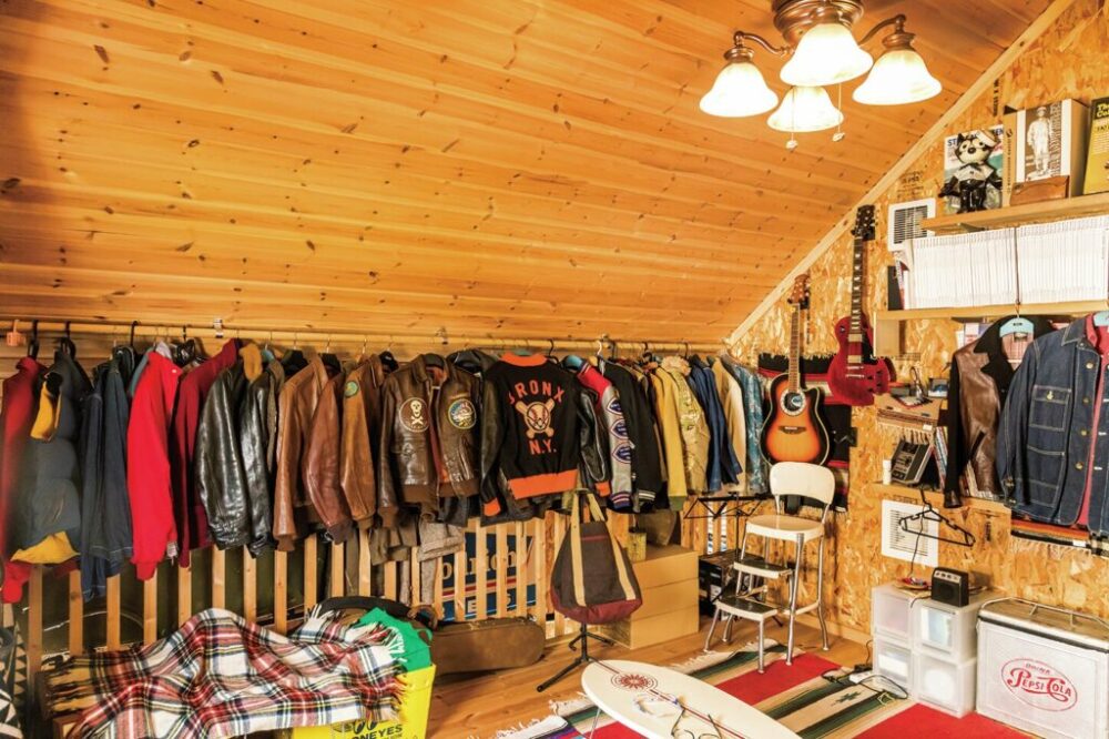 ガレージの上には屋根裏を活用した部屋があり、ここは笠松さんのプライベートルームとなっている。好きな革ジャンなどが並ぶ。