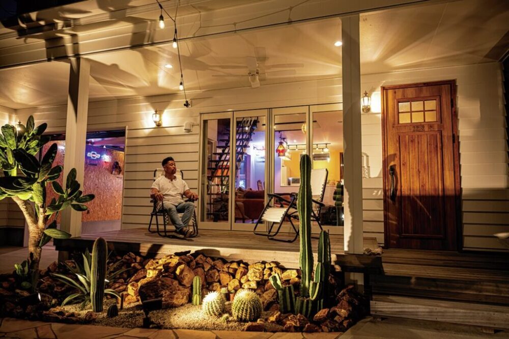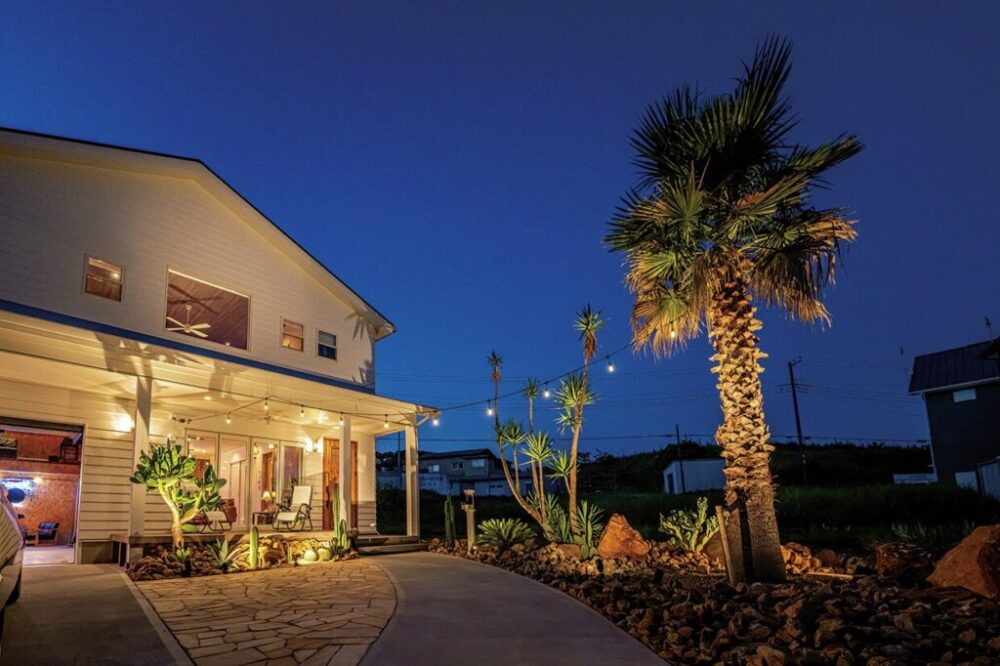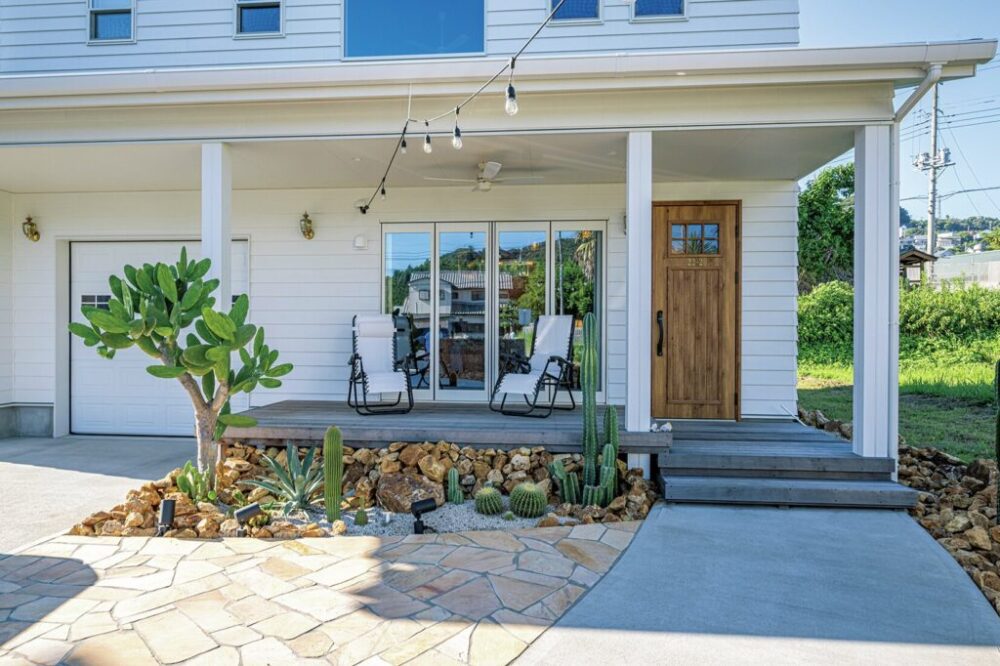庭は自分が見てきたアリゾナ州のセドナをイメージしたロックガーデンになっています。ヤシの木などの配置はもちろん、ライティングも全て自分でデザインしましたし、ガビオンにもこだわりがあったので、カゴだけ作ってもらって、石は全部自分で詰めました。カバードポーチからの眺めもお気に入り。
