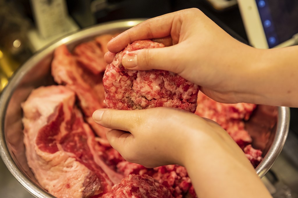 すき焼きに使われる肉の端材(落としたところ)を使用したパティだから、上質ビーフもお手頃価格で。手捏ねでふんわりと形をつくる。