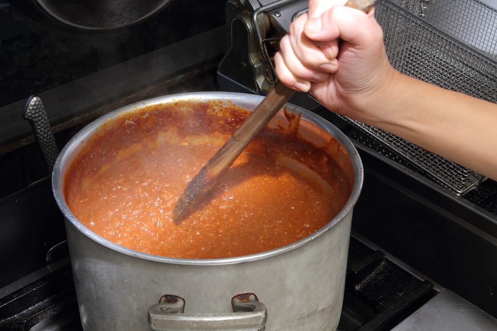 合いびき肉を約2時間煮 込んだミートソース。肉に負けないようにやや濃い味付け。この自家製ミートソースがジャクソンバーガーの味の決め手。