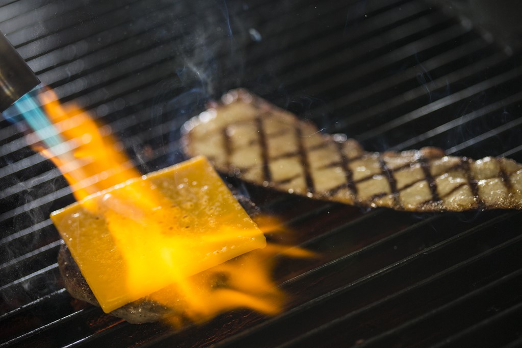 牛のクロット(腕の部分)を使ったビーフ100%のパティはバーナーでチーズにとろみをつけて仕上げる。