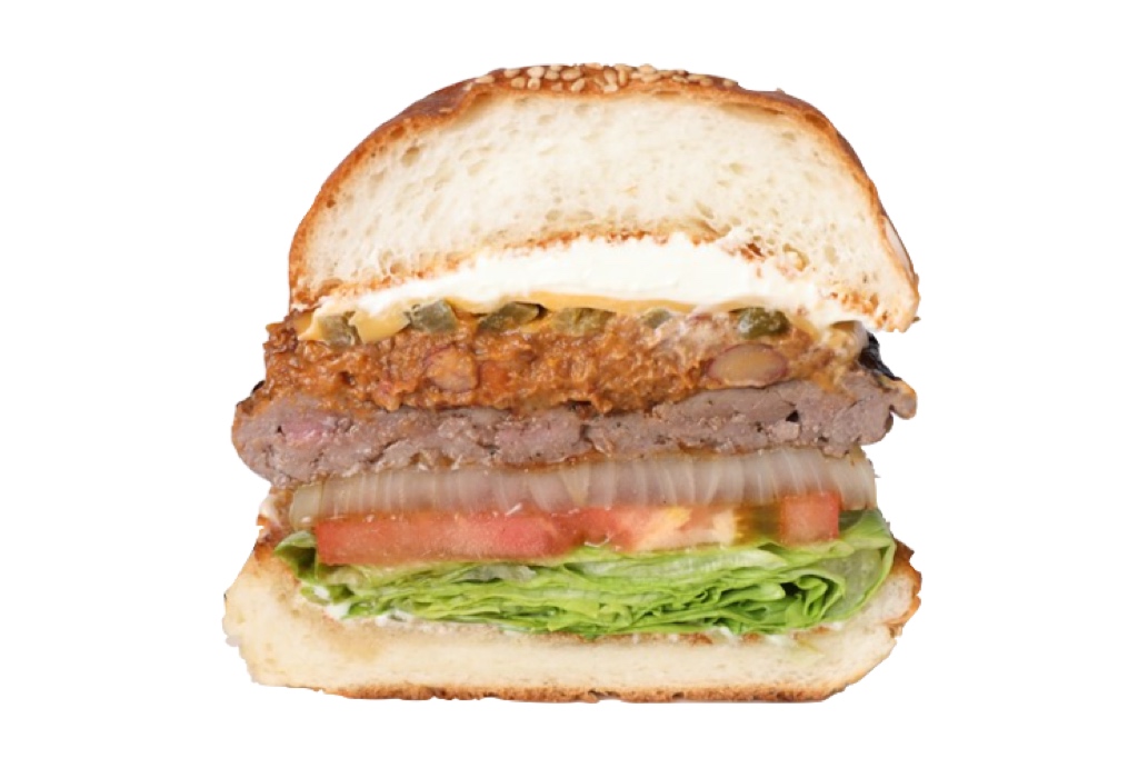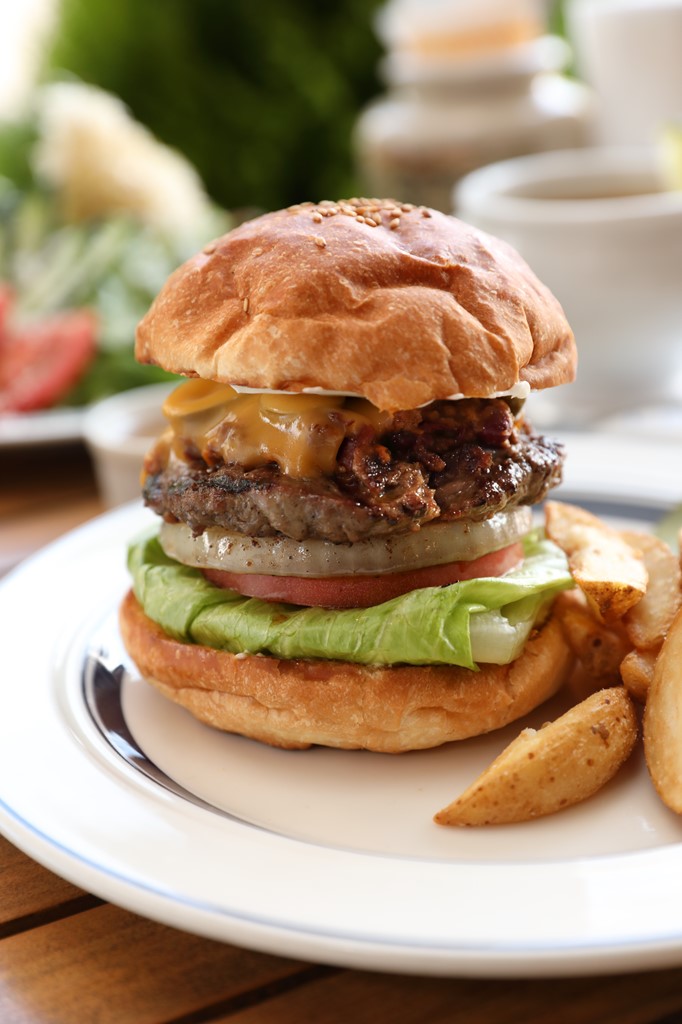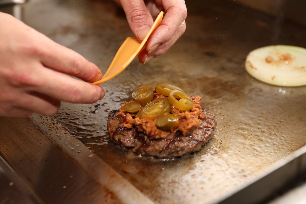 峰屋に依頼した甘みのあるオリジナルバンズにUSアンガス牛肩ロース100 %のパティを合わせている。トマト、レタス、グリルドオニオンとのバランスもよく、味の決め手に自家製タルタルソース、サワークリーム、チリビーンズ、ハラペーニョを使用。レッドチェダーもアクセントに(チーズ変更可)。1840円