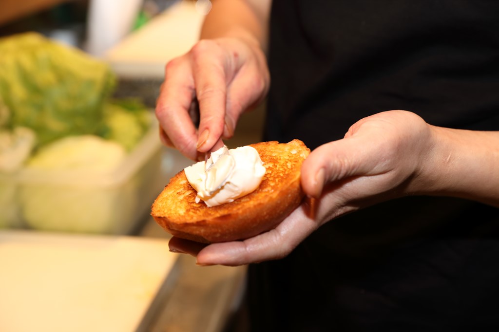 バンズの裏にサワークリームを塗ってさらに味を引き立てる。