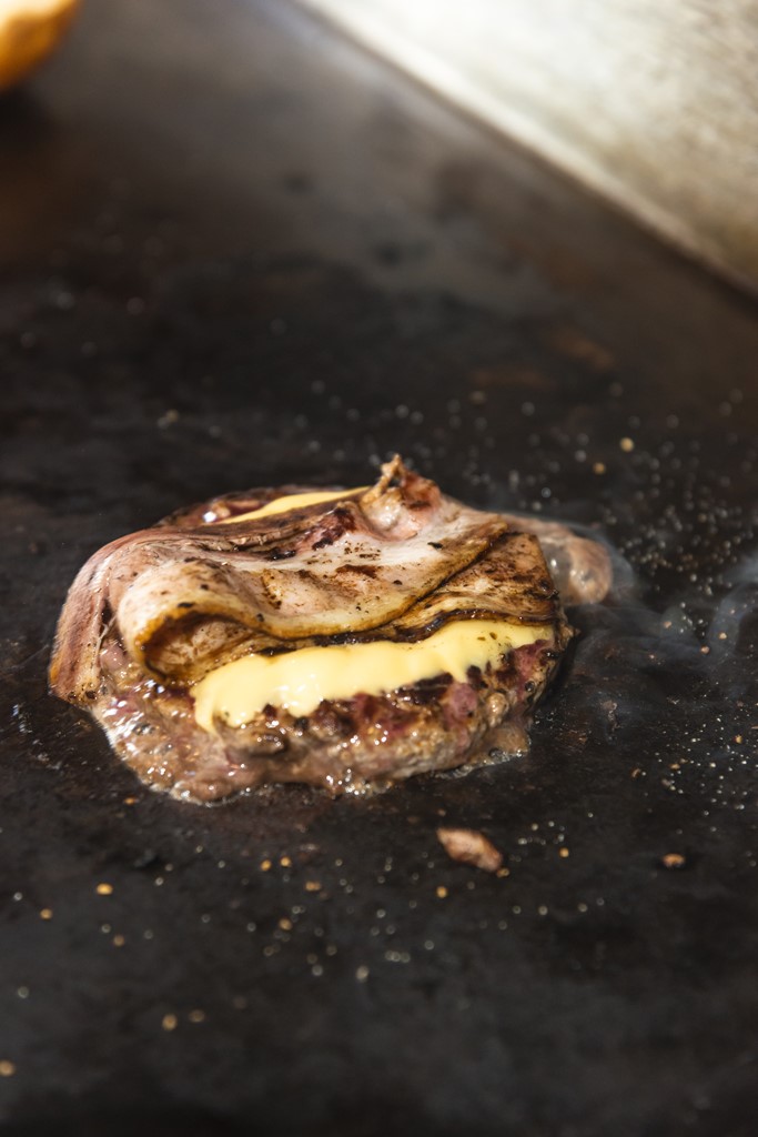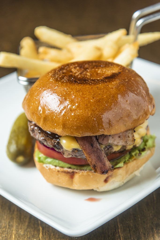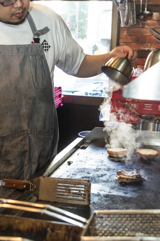 肉厚パティの両面を充分に焼くことで肉汁を閉じ込め、その上から、チーズを挟むようにカリッと焼かれたベーコンをトッピング。両面焼きのバンズとともに食感も楽しみたい。