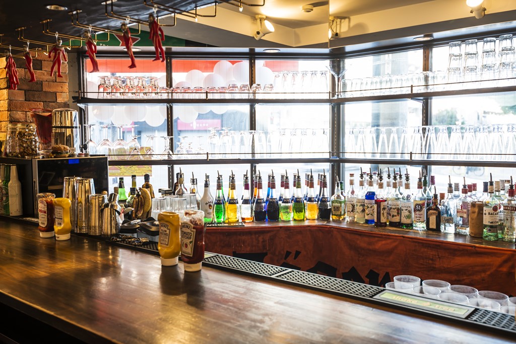 定番メニューは、ベーコンチーズバーガーだが、スペシャルメニューとしてワイルドアウトと名付けられたバンズの代わりにパティで挟んだボリューム系バーガーも人気のひとつ。さらにカウンター席も用意され、アペタイザーやサラダなどでお酒をゆっくり楽しめる大人の空間へと仕上がっている。